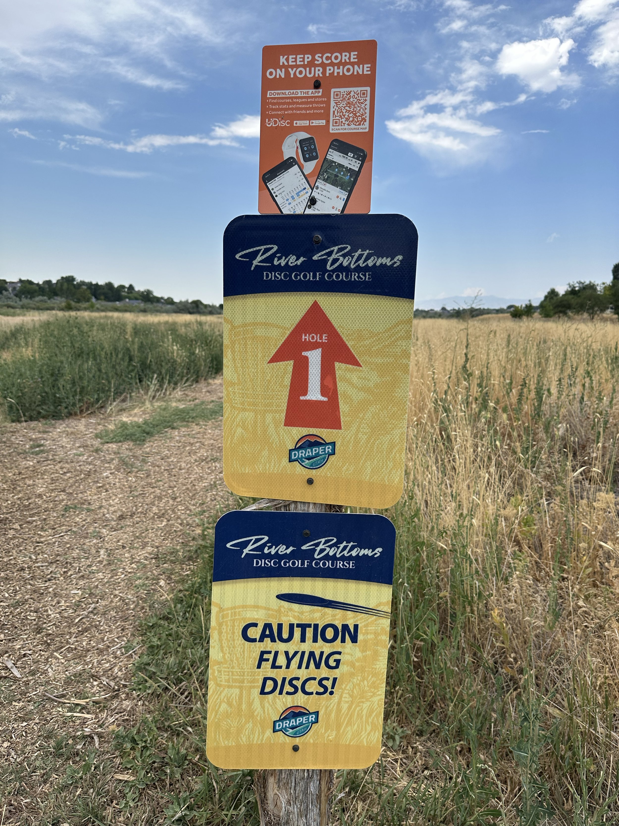 I worked with ElevateUT and Draper City Parks & Rec to map and design the River Bottoms Disc Golf Course signage, located in Draper, UT. The show piece of this scenic course is the large steel triple mando sign which frames the Wasatch front behind it. This included 18 unique tee signs utilizing high resolution drone arial footage, as well as a large kiosk map at the park entrance, plus extra courtesy signage for the public park. The city decided to use recycled metal signs which was more sustainable and cost effective.
